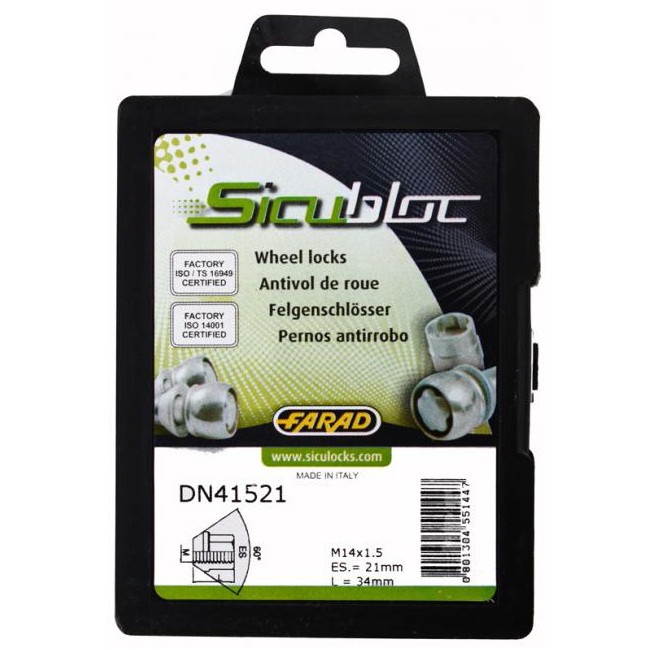 Bezpečnostní matice SICUBLOC uzavřená, rozměr M14x1,5, dosedací plocha kužel 60°, výška matice 34mm, hlava klíče 21mm, cena uvedena za sadu (4 ks).