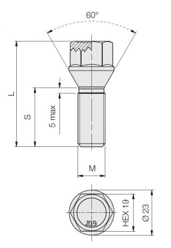 Šroub pro aftermarketová kola běžné délky pro vozy Citroen, Peugeot starší modely zpravidla do roku výroby 2002 s hlavou klíč 19mm.